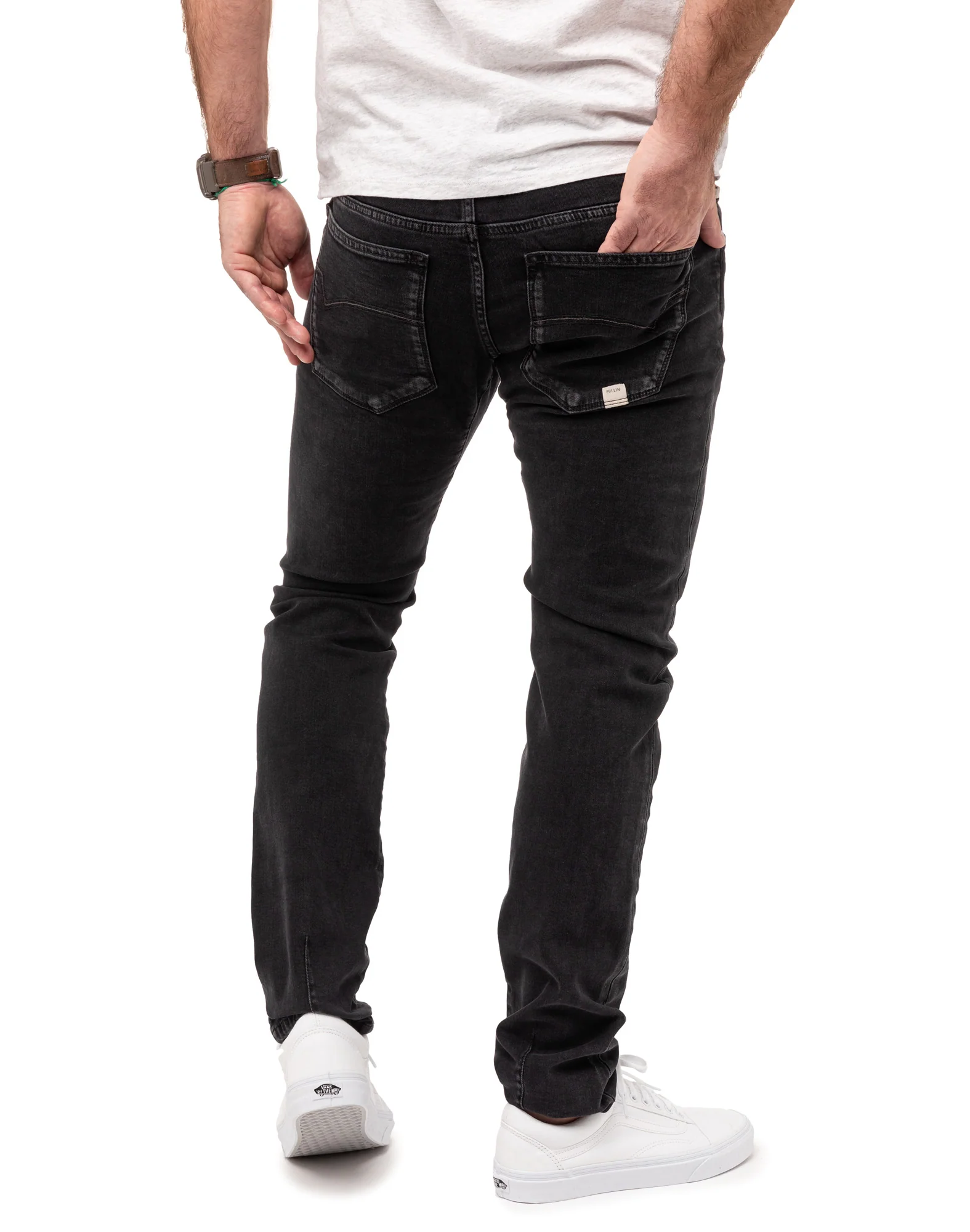 - Etiquette tissée PULLIN cousue sur le bas de la poche arrière droite.